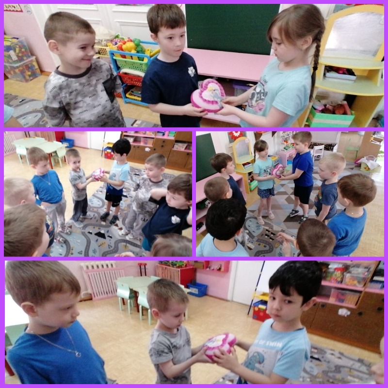 Дети учатся говорить ласковые слова о соседе справа, произносят ласковый вариант его имени или нежное, доброе пожелание, передавая сердечко доброты.