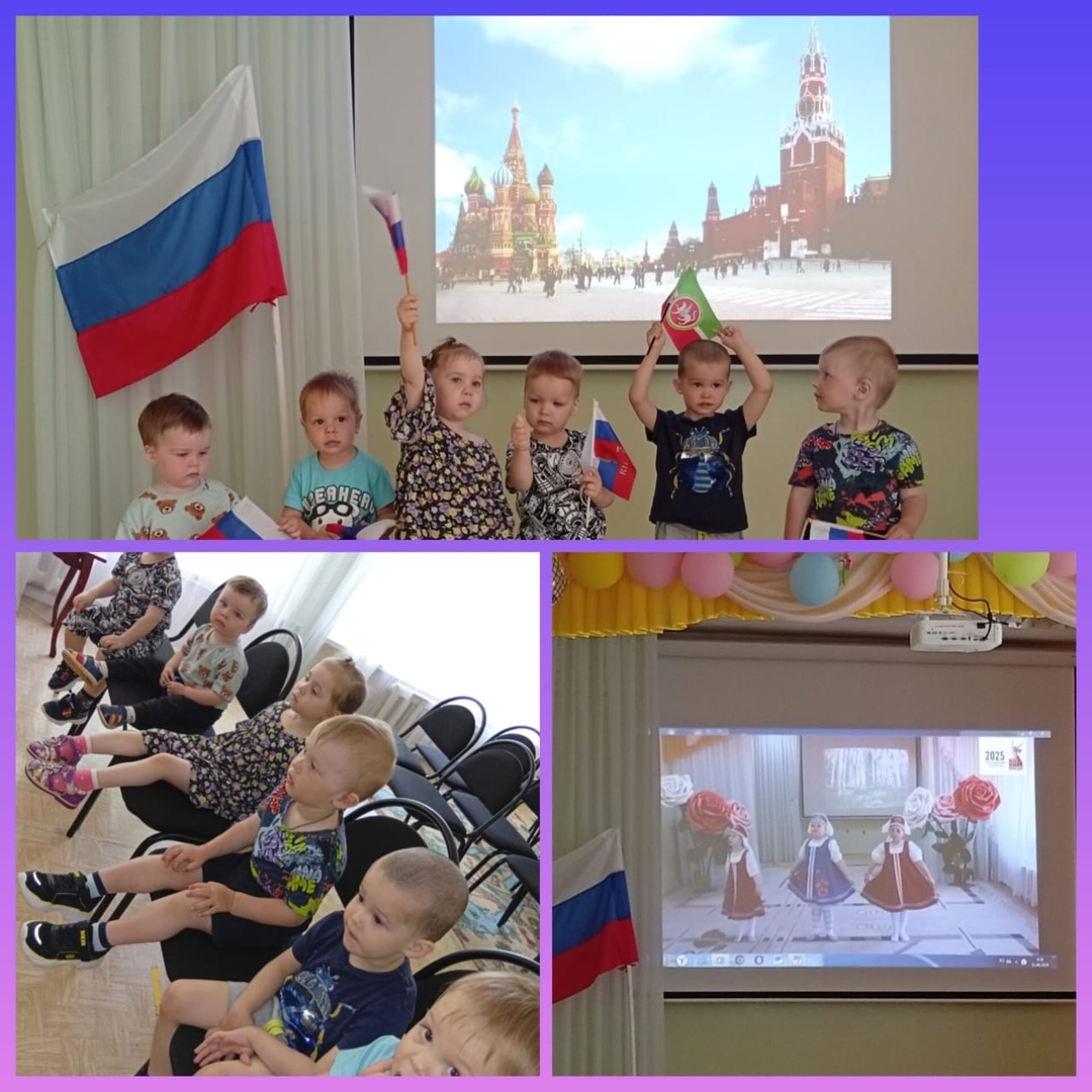 В нашем детском саду мы уделяем большое внимание знакомству детей с государственными праздниками и важными событиями в истории страны. Завтра вся страна отметит День России — праздник, который символизирует единство нашего народа и гордость за нашу страну. А сегодня, в преддверии этого знаменательного события, в нашем детском саду царила особенная атмосфера: самого утра звучали патриотические песни, в группах проводили беседы. А затем в детском саду прошло познавательно-развлекательное мероприятие «Моя Россия», посвящённое Дню нашей любимой страны. Ребята торжественно исполнили гимн России, закрепили свои знания о флаге, гербе. А также узнали о том, что наша страна – самая большая и красивая в мире, а наш родной и любимый город Бугульма — это маленькая часть огромной России. Дошкольники познакомились с людьми, которые имеют отношение к нашему городу. А ещё, как и принято на празднике, водили хороводы, пели песни и танцевали, отгадывали загадки, читали стихи.