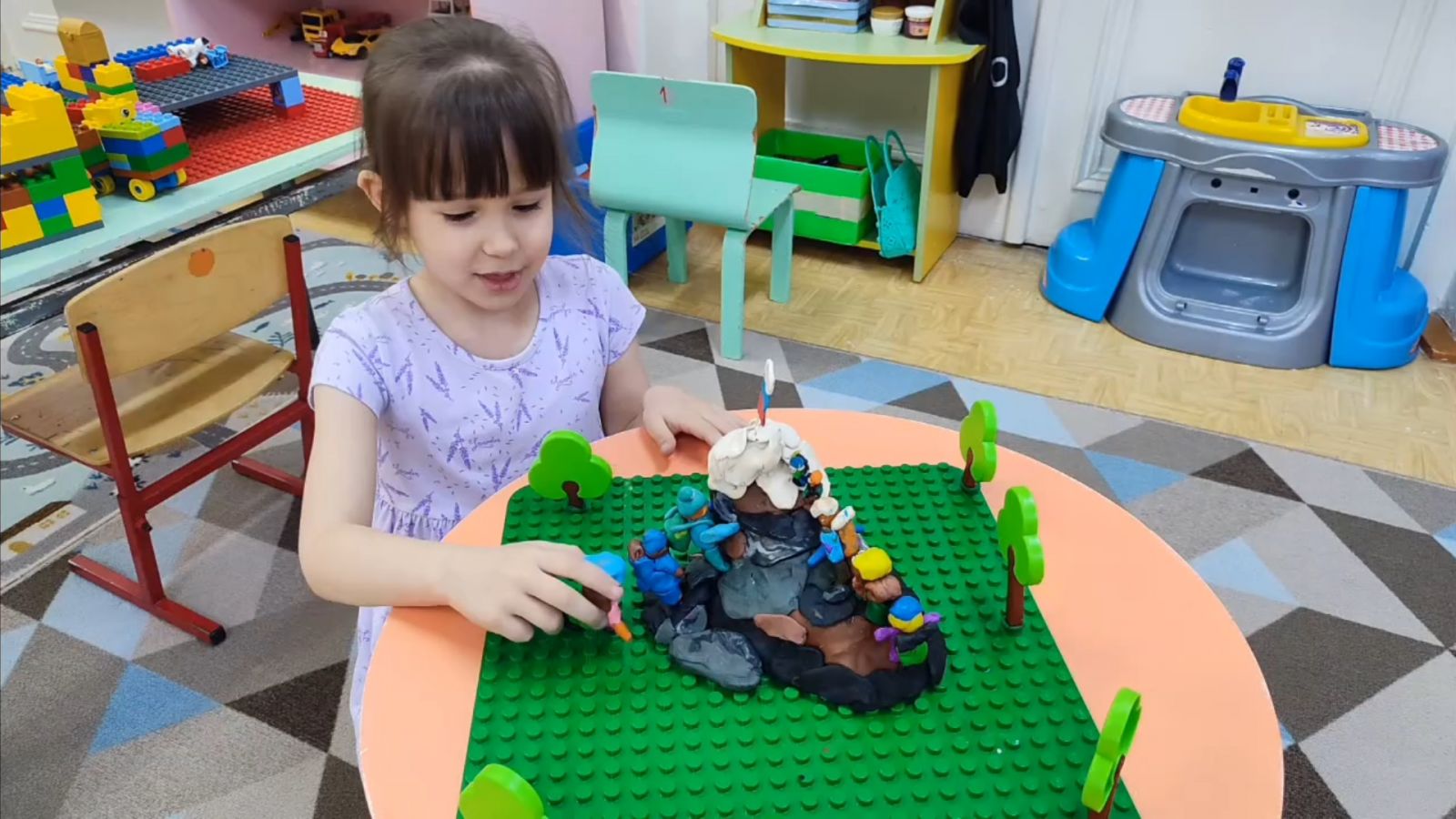В продолжении темы "Неделя нескучного здоровья" ребята группы "Ромашка" на занятии по лепке совершили виртуальную экскурсию в горы и создали свою композицию "Туристы в горах".