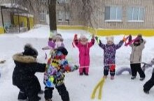 В нашем саду кипели настоящие снежные баталии! Ребята наперегонки катались на санках, играли в «Забавный хоккей», соревновались в меткости в «Попади в цель» и дружно тянули канат!