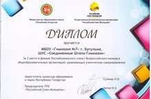 С 15 по 17 мая в Казани проходил Фестиваль детских общественных организаций и органов ученического самоуправления образовательных организаций Республики Татарстан «Инициатива -2015». Бугульминский район и гимназию №7 на этом Фестивале представляли ученики 8 класса А Айдар Газизов, Камилла Мамедова, Святослав Яровкин. За активное участие им был вручен Диплом за III место в финале Республиканского этапа I Всероссийского конкурса общеобразовательных организаций, развивающих ученическое самоуправление.