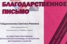 Классный руководитель 4-го класса Габдрахманова С.Р награждена Благодарственным письмом за подготовку участников Всероссийской олимпиады.