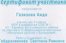 Газизова Аида и Кашапова Альмира ученицы 4-го класса участвовали в III Всероссийской викторине "Нескучный русский с Буквознаем" и получили Сертификаты участника. Удачи!