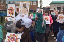 “Үлемсез полк” акциясе кысаларында мәктәп укучылары кулларына Бөек Ватан сугышы геройларының портретларын һәм чәчәкләр тотып, һәйкәл янына юл алды. Аларга әби-бабайларын, туганнарын, якыннарын сугышта югалткан башкалар да бик теләп кушылды. Ил азатлыгы өчен шаһит киткән каһарманнарыбыз бүгенге бәйрәм көнендә шул рәвешле “сафка басты”. Һәр портрет – үзе бер тарих, истәлек. Батырларның даны мәңгелек, күпме сулар акса да, алар турында хатирәләр халык күңеленнән җуелмыйча, буыннан буынга тапшырылып килер. Акциядә катнашучылар мәңгелек утка чәчәкләр куйдылар.