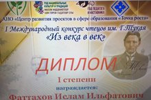 3 сыйныф укучысы Фәттахов Ислам I Халыкара укучылар конкурсында катнашты. Г.Тукай җиңүче булды. I дәрәҗә дипломы белән бүләкләнде. Әфарин, Ислам. Конкурс "Үсеш ноктасы " АКБО “Мәгариф өлкәсендә проектларны үстерү үзәге" тарафыннан оештырылды.