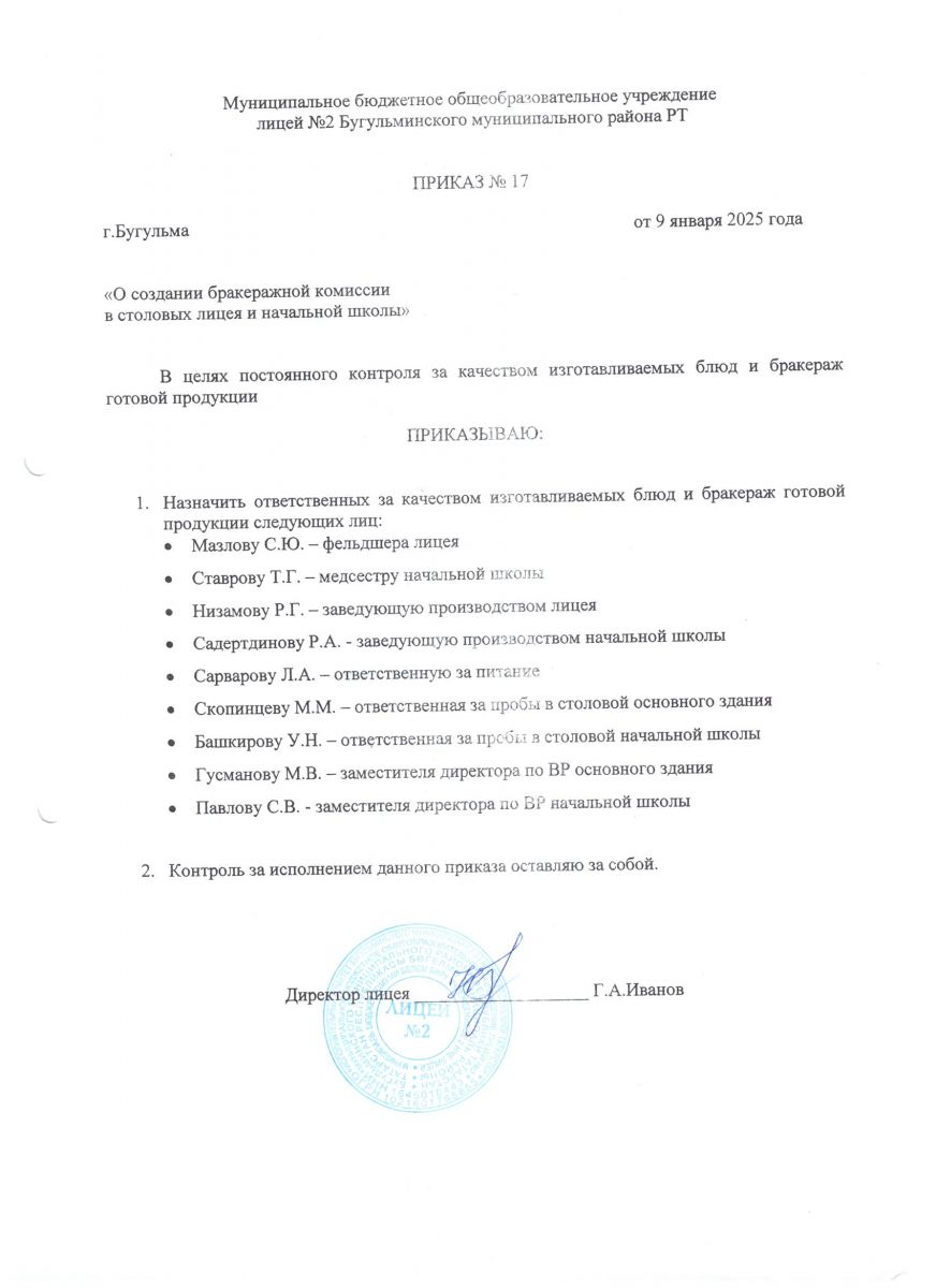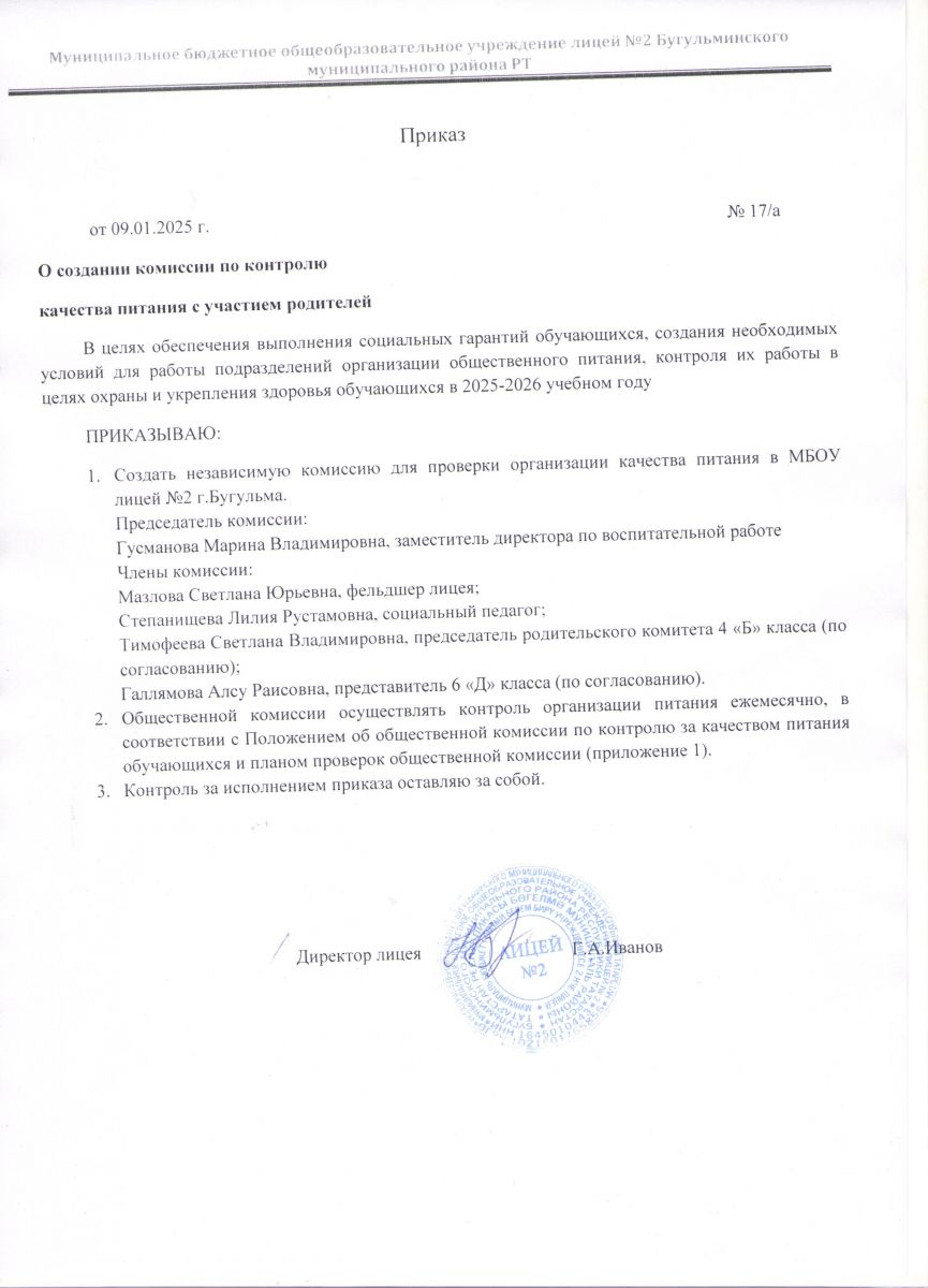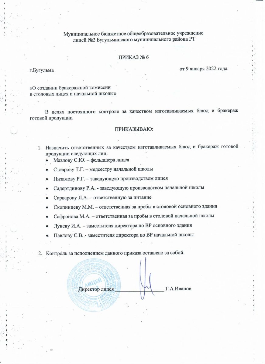 - Приказ "О создании бракеражной комиссии в столовой лицея"