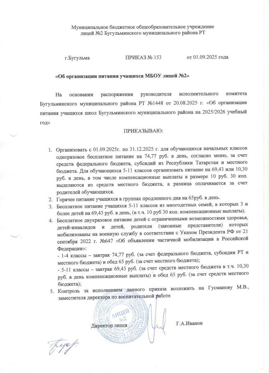 - Приказ №191-о/д Управления Образованием от 28.08.2020 "Об организации питания учащихся школ Бугульминского муниципального района"