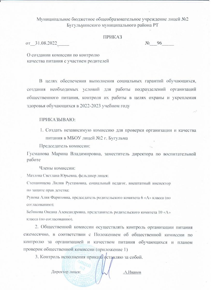 - Приказ о создании комиссии по контролю качества питания с участием родителей 22-23