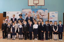Почётные гости, активисты Движения Первых, Юнармейцы вручили первоклассникам значки «Орлята России». -