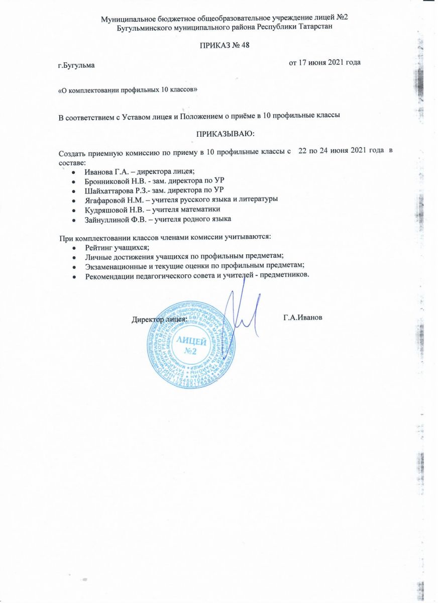 Приказ о создании комиссии для приёма в 10 профильные классы