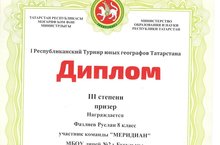 26-28 ноября 2016 года на базе ООЦ "Дуслык"(г.Казань) был проведён I Республиканский турнир юных географов Татарстана. Честь нашего лицея защищала команда "Меридиан", в состав которой входили Гайнатуллин Данис (11Б), Рачкова Анатасия (9Б), Фазлиев Руслан (8Д), Фомин Станислав (10В), Шмелькова Сабина (10Б).