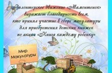 9 апреля 2016 г. наш лицей принял участие в благотворительной акции по сбору макулатуры «Книга – каждому ребенку» для волонтерского движения «Мамонтенок». На средства, вырученные с акции, будут куплены книги для детей из многодетных семей, детей-инвалидов и детей из приюта «Ялкын».
