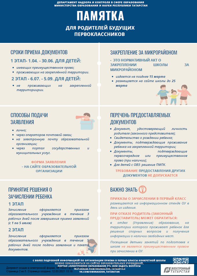 Администрация Малобугульминской средней школы доводит до вашего сведения, что согласно Приказа Минпросвещения России от 02.09.2020 под № 458"Об утверждении Порядка приема на обучение по образовательным программам начального общего, основного общего и среднего общего образования"", Положения о правилах приема на обучение по программам начального общего, основного общего, среднего общего образования в Малобугульминскую среднюю школу с 1 апреля 2021 года начинается прием заявлений на обучение в первый класс для детей указанных в пунктах 9,10 и 12 «Порядка приема на обучение по образовательным программам начального общего, основного общего и среднего общего образования», а также проживающих на закрепленной территории и завершается 30 июня 2021г.