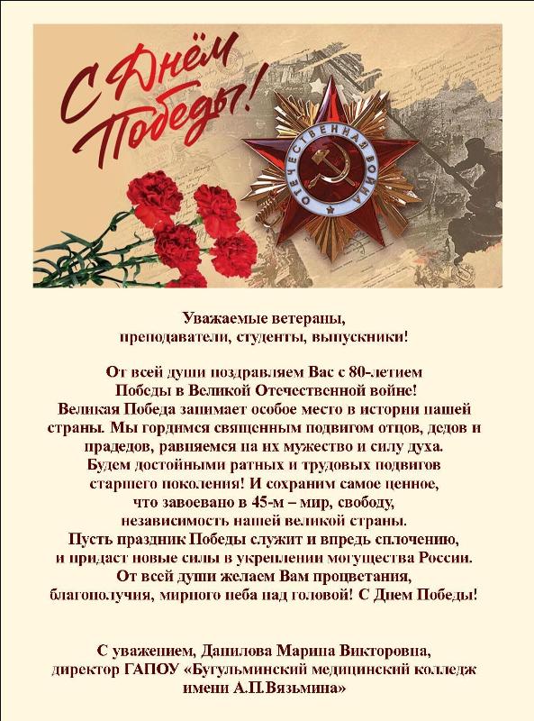 Самое главное в медицине – высокое чувство ответственности, профессионализм, отзывчивость и желание помочь людям. Пусть выбранная Вами профессия открывает новые горизонты, дарит вдохновение и энергию для новых успехов!