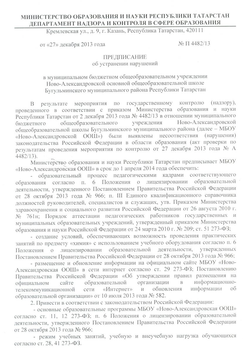 Предписание департамента надзора и контроля в сфере образования МО и надзора РТ от 27 декабря 2013 года № 4482/13