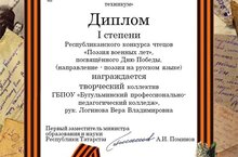 Под руководством Веры Владимировны Логиновой, творческий коллектив, в составе Лукинской Валерии, Филимоновой Кристины, Шутовой Вероники, Валиева Радэля, Басориной Элины и Чагановой Валерии получили Диплом I степени, победив в Республиканском конкурсе "Поэзия военных лет"