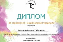 С 28 октября по 14 ноября 2022 года на базе государственного автономного профессионального образовательного учреждения «Набережночелнинский педагогический колледж» проходил Всероссийский фестиваль творчества безграничных возможностей для студентов профессиональных образовательных организаций «Творец судьбы». Наш колледж на данном конкурсе представила студентка группы ДО-19-2 Гилязова Алина. По итогам Алина была удостоена диплома «За сохранение национальных традиций» в номинации «Вокальное искусство» (рук. Асадуллина Н.А.). Поздравляем Алину с победой и желаем дальнейших творческих успехов!