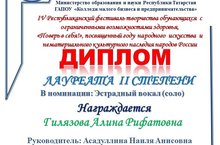 28 февраля были подведены итоги IV Республиканского фестиваля творчества «Поверь в себя!», посвященный году народного искусства и нематериального культурного наследия народов России. По итогам конкурса студента группы ДО-19-2 Гилязова Алина удостоена диплома лауреата II степени в номинации Эстрадный вокал (соло).