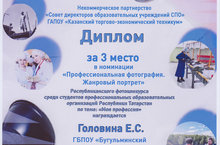 5 апреля были подведены итоги Республиканского фотоконкурса среди студентов профессиональных образовательных организаций Республики Татарстан по теме «Моя профессия». Среди студентов нашего колледжа в конкурсе приняли участие: Сотникова Е.. (гр. ДО-18) номинация «Серия кадров» с работой «В гостях у маленьких человечков», Головина Е., (гр. ДО-18) номинация «Жанровый портрет». По итогам конкурса Головина Екатерина удостоена диплома за 3 место (рук. Фирсова Л.Р.). Поздравляем с победой!