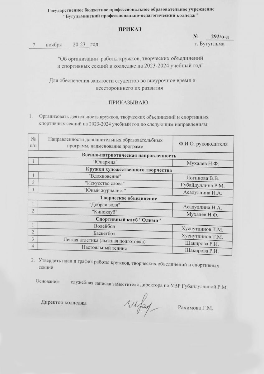 Приказ об организации работы кружков, творческих объединений и спортивных секций в колледже