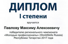 Поздравляем студента Павлова Максима, занявшего первое место на региональном этапе конкурса WorldSkills Russia покомпетенции «Малярные и декоративные работы»! Являясь победителем регионального чемпионата «Молодые профессионалы» (WorldSkills Russia) Республики Татарстан 2017 года, Максим стал участником сборной команды Татарстана. Ему предстоит участие в финале национального чемпионата WorldSkills Russia в Краснодаре с 15 марта по 3 апреля 2017 года.