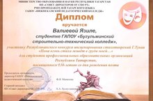 В соответствии с планом работы РМО преподавателей татарского языка и литературы юго-восточного региона Республики Татарстан 15 апреля 2016 года на базе ГАПОУ «Бугульминский строительно-технический колледж» состоялся региональный конкурс студенческих театров, посвященного 130-летию со дня рождения Габдуллы Тукая среди студентов ПОО юго-востока РТ.