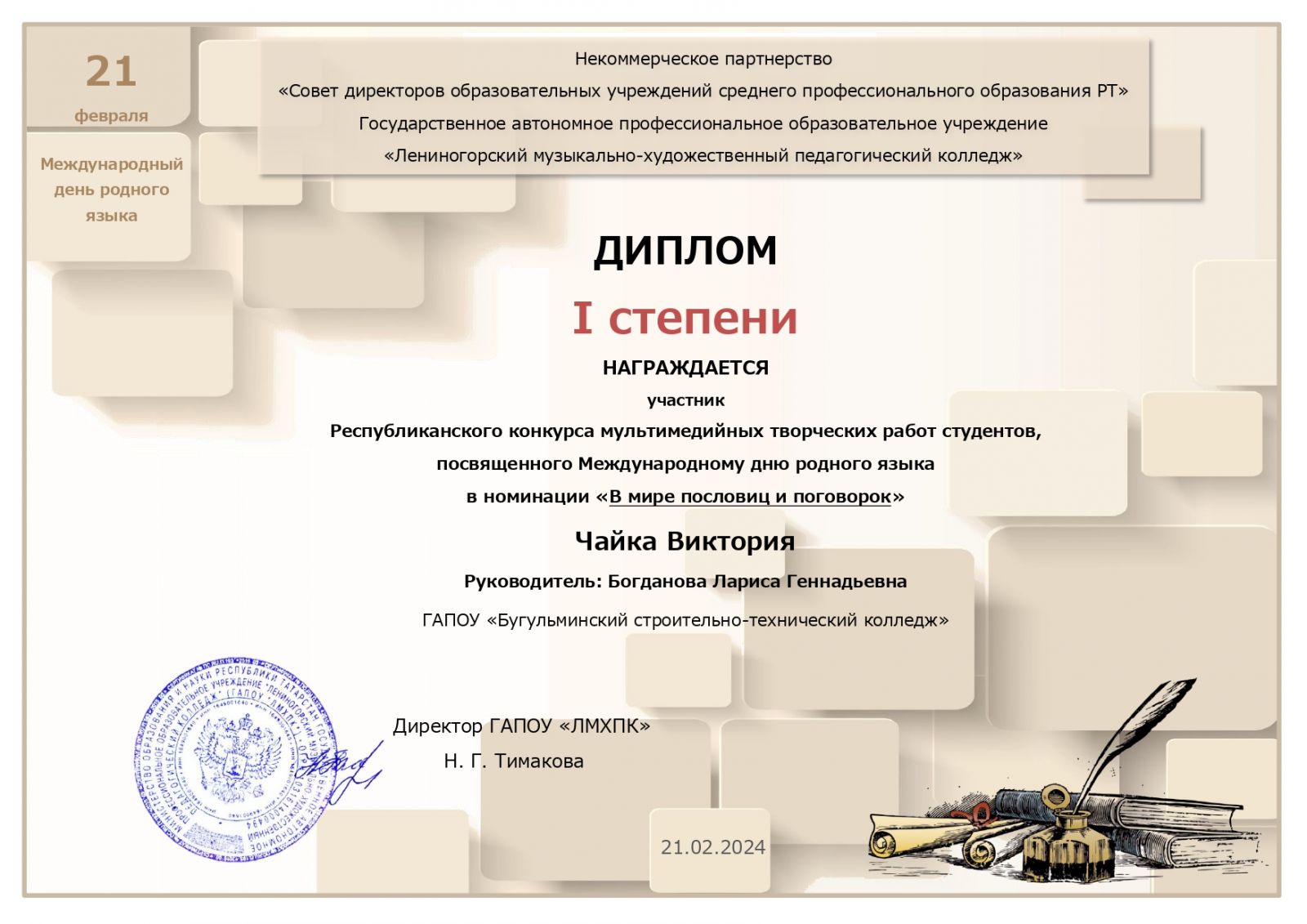 В соответствии с планом работы Некоммерческого партнерства «Совет директоров образовательных учреждений СПО РТ» на 2023-2024 учебный год, в г. Лениногорск состоялся Республиканский конкурс мультимедийных творческих работ студентов, посвященный Международному дню родного языка.
