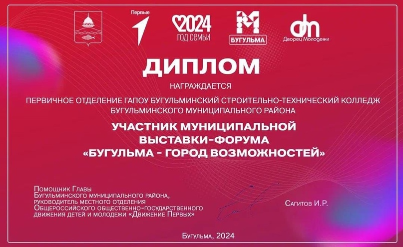 Участники выставки были награждены Дипломом, а по итогам работы выставки-форума «Бугульма - город возможностей» Оргкомитетом было принято решение, что ГАПОУ «Бугульминский строительно-технический колледж» в стал обладателем Кубка Первых среди всех колледжей и техникумов города. -