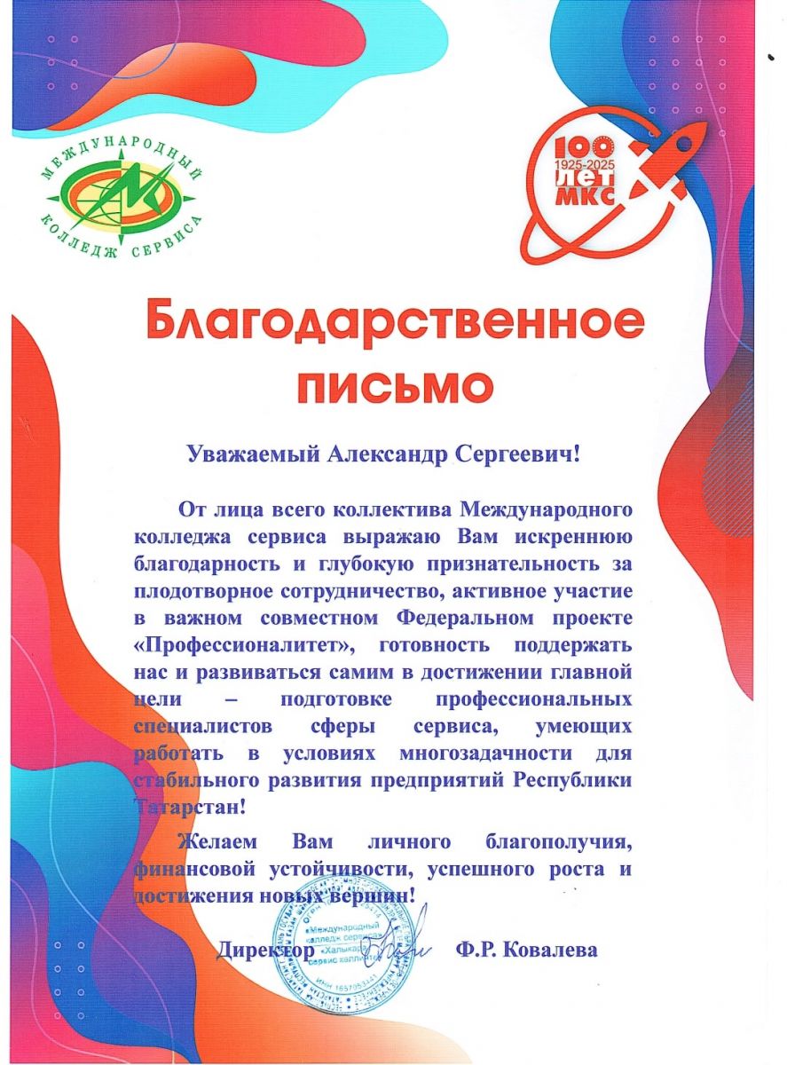 БЛАГОдарность от нашего партнера и друга - Международного колледжа сервиса.