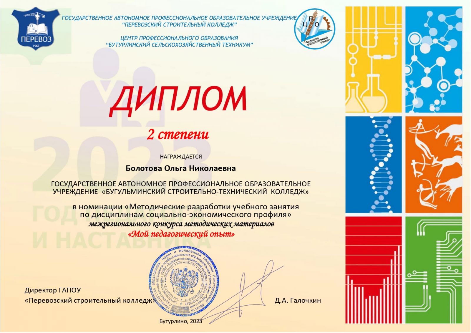 От ГАПОУ «Бугульминский строительно-технический колледж» в конкурсе в различных номинациях приняли участие педагоги: Богданова Л.Г., Земскова М.М., Болотова О.Н., Лыкова Г.В. По итогам конкурса все педагоги колледжа награждены Дипломами за 2 и 3 места.