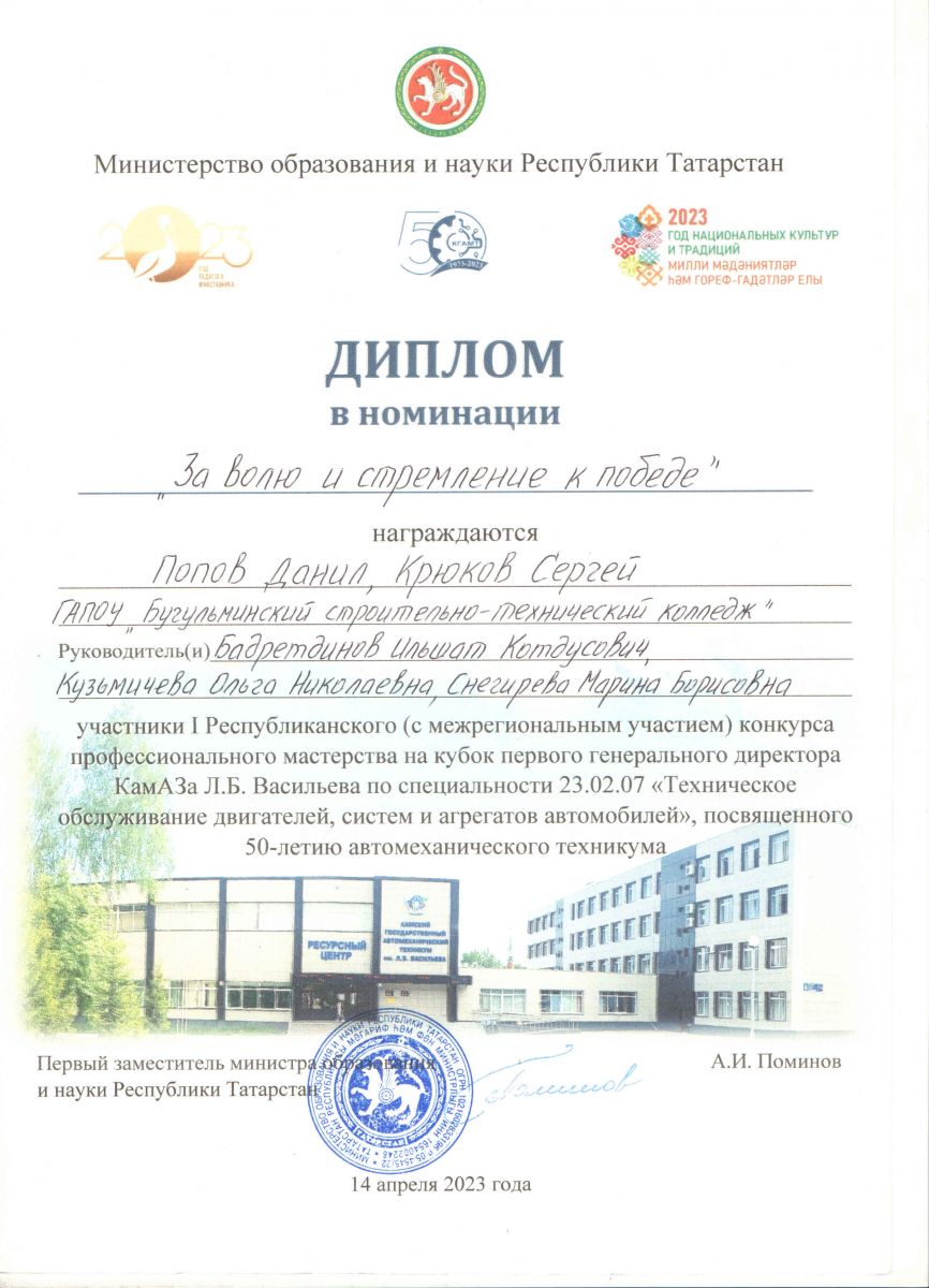 В соответствии с Календарным планом мероприятий Министерства образования и науки Республики Татарстан на 2022/2023 учебный год, в г. Н. Челны впервые состоялся Республиканский (c межрегиональным участием) конкурс профессионального мастерства на кубок первого генерального директора КамАЗа Л.Б. Васильева по специальности 23.02.07 Техническое обслуживание двигателей, систем и агрегатов автомобилей.