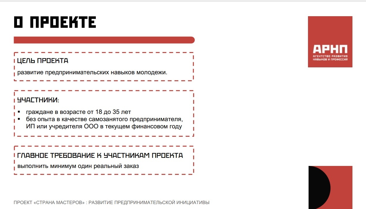 Организаторами проекта выступают Министерство труда и Агентство развития навыков и профессий. Цель проекта «Страна мастеров» Главной целью Проекта является развитие предпринимательских навыков молодежи. Согласно планам Минэкономразвития, количество малых и средних предпринимателей должно увеличиться до 25 миллионов к 2024 году, и Проект должен способствовать достижению ключевых показателей. Участниками Проекта могут быть граждане в возрасте от 16 до 35 лет, которые ранее не имели опыта в качестве самозанятого предпринимателя, ИП или учредителя ООО. В первую очередь, речь идет о тех людях, которые имеют профессиональные навыки и могут их подтвердить, но им нужна правовая и психологическая поддержка для самостоятельного ведения бизнеса. Главное же требование к участникам – готовность после окончания участия в проекте стать самозанятым или предпринимателем, а также выполнить как минимум один реальный заказ. Это значит, что вам как тьюторам предстоит работать с мотивированными людьми, которые знают свою цель и готовы ее достичь, только нужно оказать им небольшую поддержку.