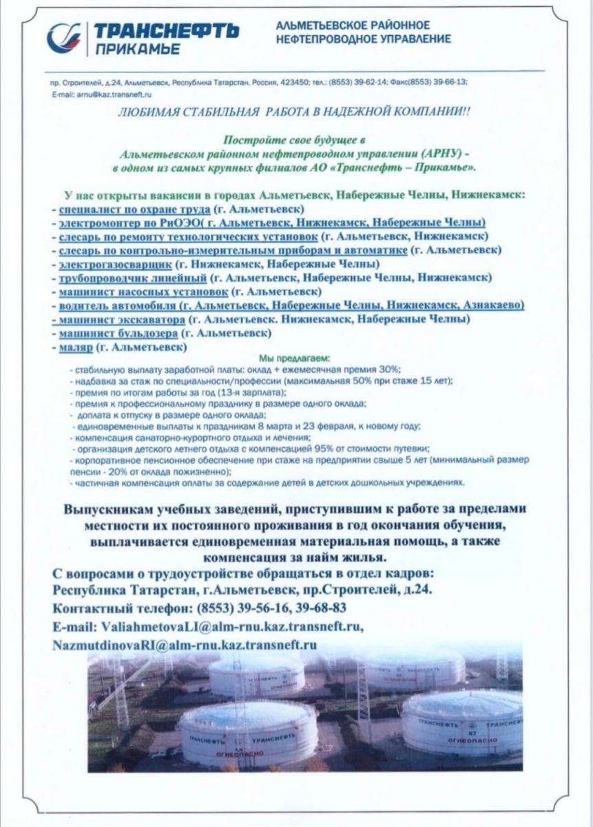 Работа в Альметьевском РНУ АО «Транснефть-Прикамье» в городах Альметьевск, Набережные Челны, Нижнекамск, Азнакаево.