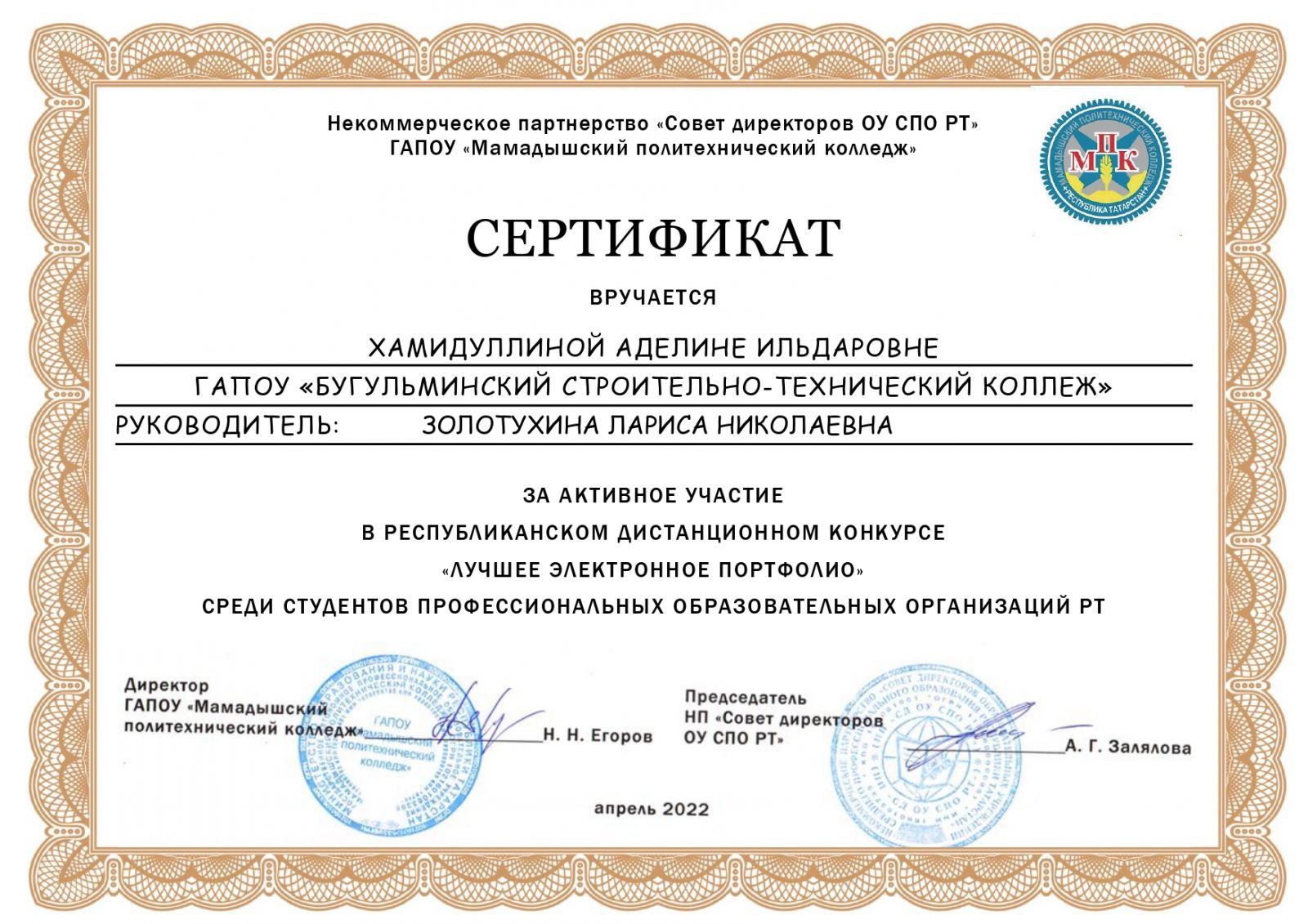В соответствии с планом работы Некоммерческого партнерства «Совет директоров образовательных учреждений СПО Республики Татарстан» на 2021 – 2022 учебный, 18 мая 2022 года на базе ГАПОУ «Мамадышский политехнический колледж» был проведен Республиканский дистанционный конкурс «Лучшее электронное портфолио» среди студентов профессиональных образовательных организаций РТ.