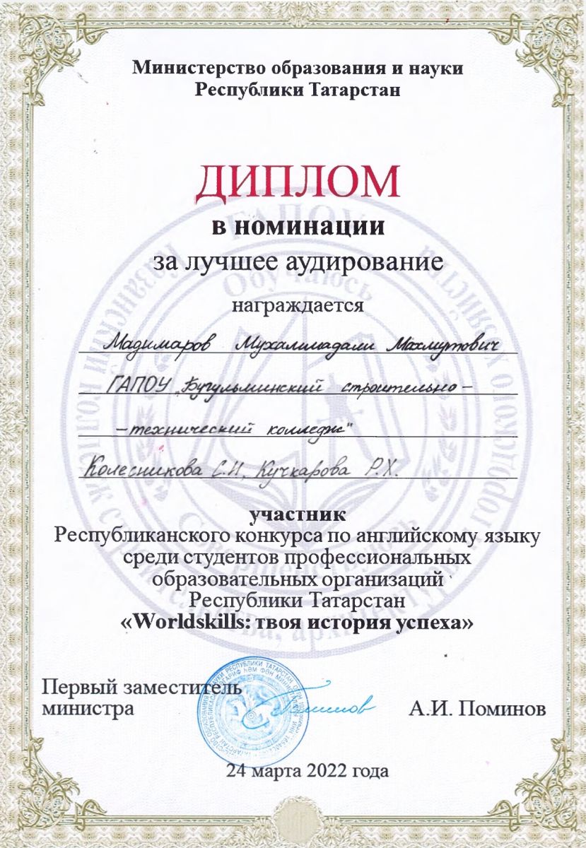 ГАПОУ «БСТК» представлял студент 3-го курса Мадимаров Мухаммадали, обучающийся по специальности 23.02.03 Техническое обслуживание и ремонт автомобильного транспорта. Успешно выполнив все задания конкурса и набрав наибольшее количество баллов на втором этапе, Мухаммадали награжден Дипломом в номинации «За лучшее аудирование».