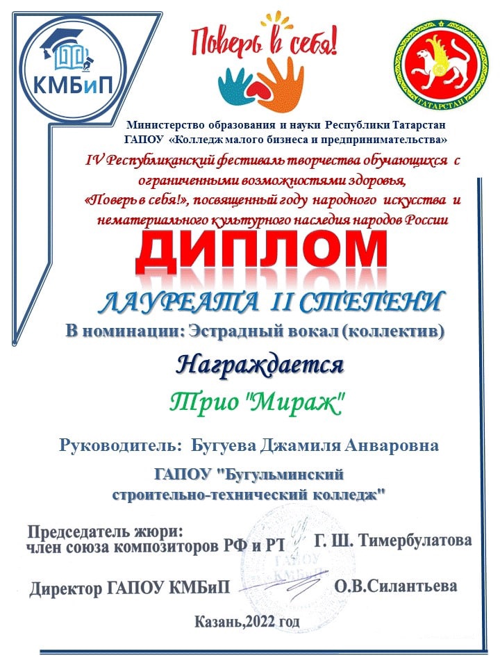 Студенты Бугульминского строительно-технического колледжа приняли участие в IV Республиканском фестивале творчества обучающихся с ограниченными возможностями здоровья «Поверь в себя!», посвященного году народного искусства и нематериального культурного наследия народов России. Студенты - это трио «Мираж» в составе Фролова Андрея, Вороновой Ирины и Клишиной Елены под руководством педагога дополнительного образования Бугуевой Джамили Анваровны подготовили музыкальный номер и в номинации Эстрадный вокал были награждены Дипломом лауреата II степени. Мы от всей души поздравляем ребят с победой и желаем им новых творческий побед!