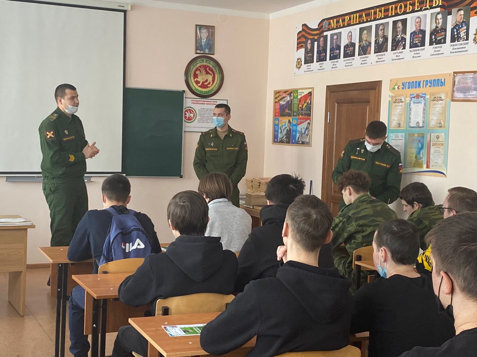 Представители Военного комиссариата Бугульмы посетили Бугульминский строительно-технический колледж. На встрече со студентами выпускных курсов было рассказано об особенностях прохождения военной службы по призыву. Особо обращено внимание юношей на возможность прохождения военной службы по контракту