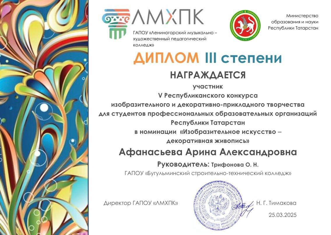 Поздравляем студентку 3-го курса специальности «Конструирование, моделирование и технология изготовления изделий легкой промышленности (по видам) Афанасьеву Арину с отличным результатом - Дипломом 3 степени!