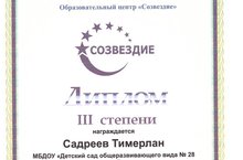 Воспитакнник нашего ДОУ, подготовительной группы "Почемучки" Садреев Тимерлан, получил диплом 3 степени в осеннем туре Республиканской олимпиады среди дошкольников "Подготовишки". Олимпиада была организована образовательным центром "Созвездие".