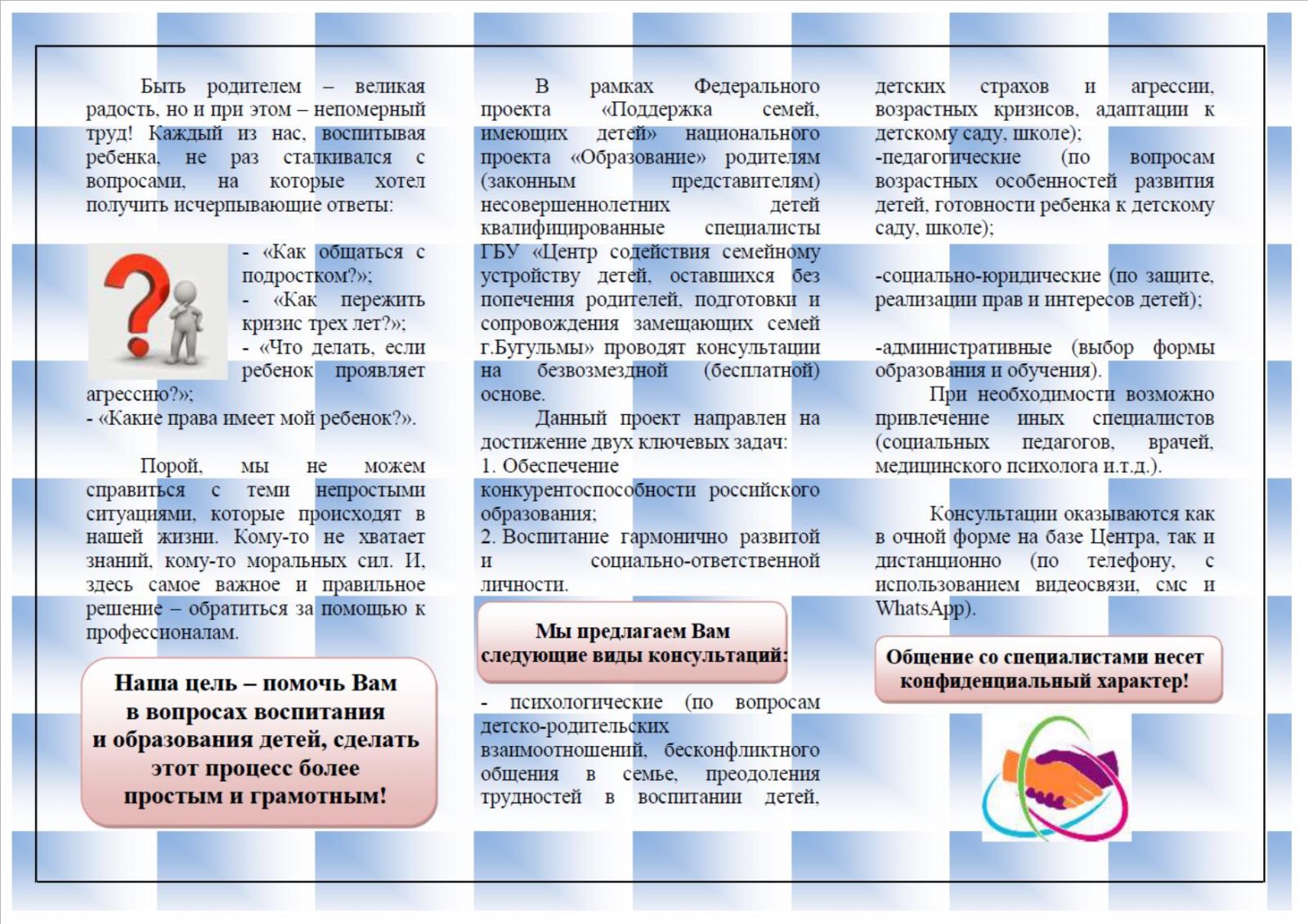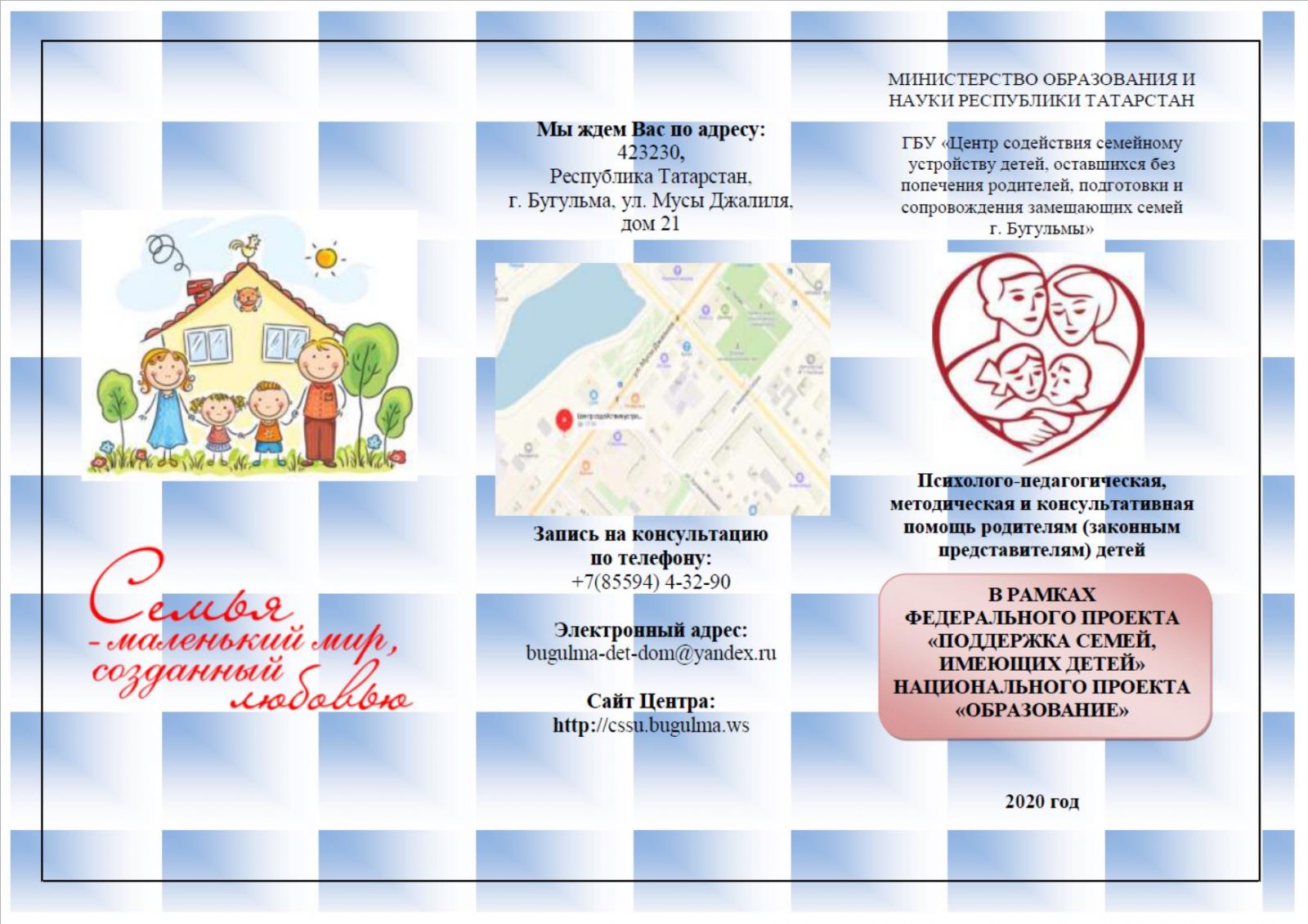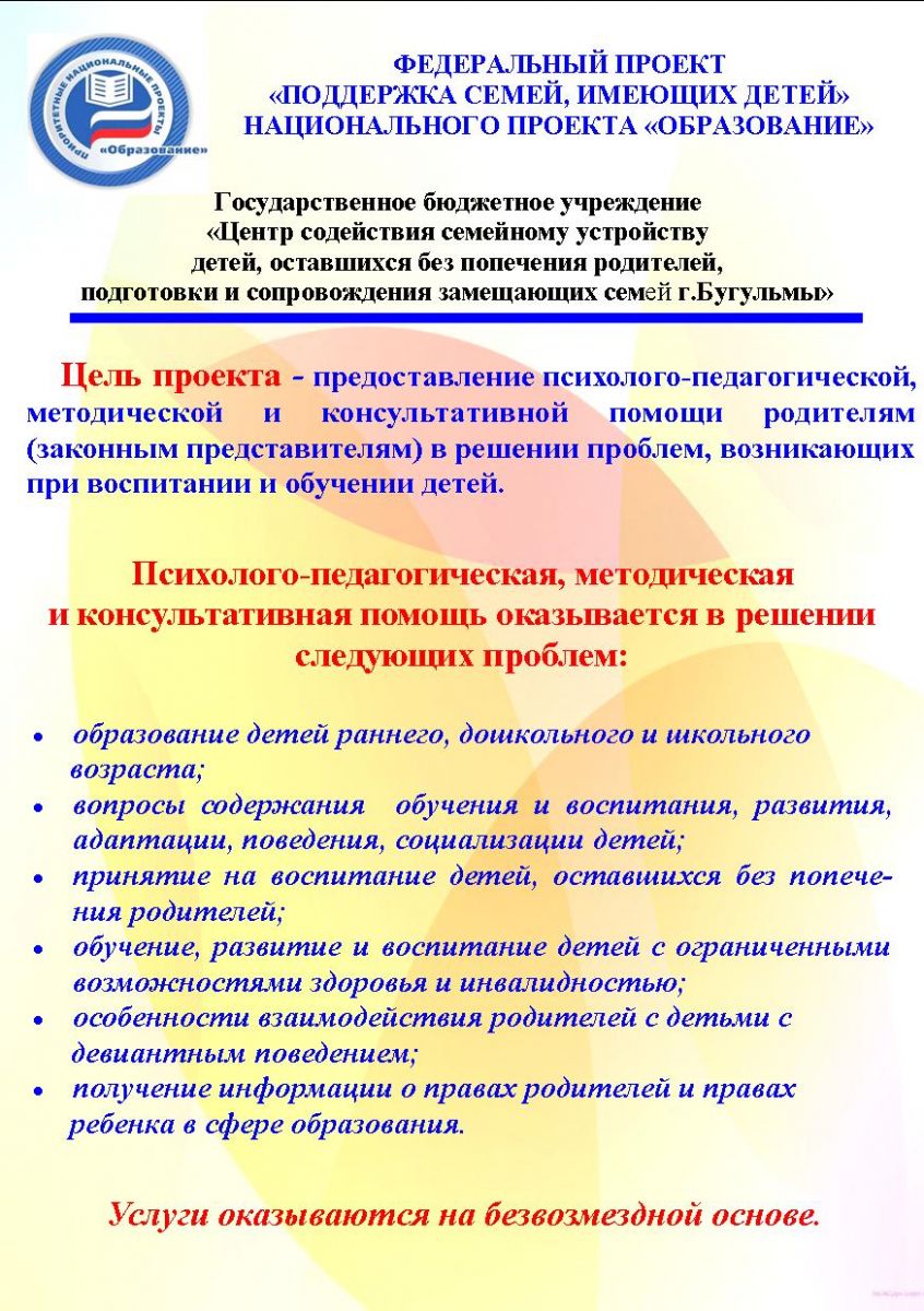 ГБУ "Центр содействия семейному устройству детей, оставшихся без попечения родителей, подготовки и сопровождения замещающих семей г. Бугульмы" (далее Центр) является консультационным центром "Навстречу семье" в рамках федерального проекта "Поддержка семей, имеющих детей" национальном проекте "Образование". Данный проект направлен на создание условий для повышения компетентности родителей в вопросах развития, воспитания и образования, путем предоставления бесплатных консультаций гражданам, имеющих несовершеннолетних детей в возрасте от 0 до 18 лет.