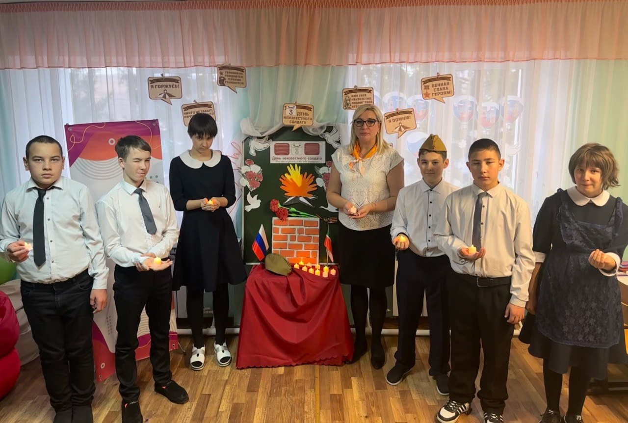 Сегодня советником директора по воспитанию, Низамутдиновой Натальей Викторовной, совместно с активистами 6 и 7 класса ГБОУ "Сокольская школа - интернат для детей с ОВЗ", Бугульминский район, с. Соколка, организован Урок памяти: "Неизвестный солдат - сын народа". Ребята узнали историю возникновения памятной даты, организовали стихийный мемориал в память неизвестному солдату. На мероприятии также прошла акция «Свеча памяти», в ходе которой мы зажгли свечи в честь всех павших воинов, а также провели минуту молчания. Эта дата – дань памяти и уважения бессмертному подвигу павших защитников Отечества. «Нельзя научиться любить живых, если не умеешь хранить память о павших» – эти слова принадлежат Маршалу Советского Союза Константину Рокоссовскому.