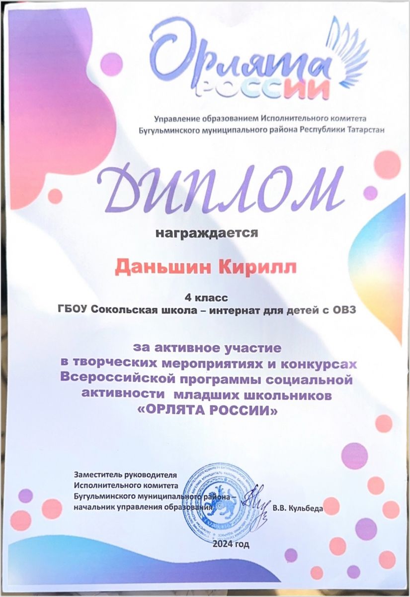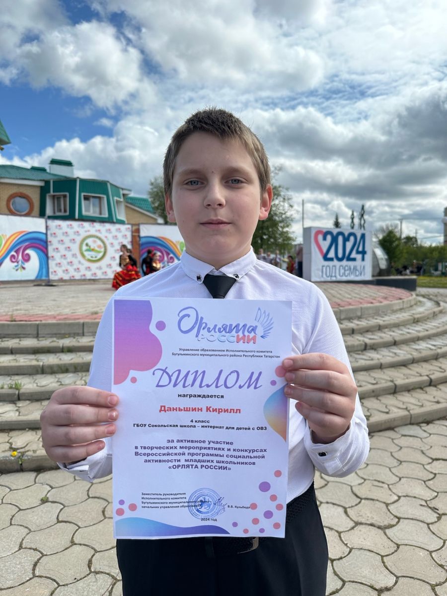 Сегодня в Детском Парке г. Бугульма состоялся муниципальный Праздник «Мы вместе! Мы едины!», посвященный Дню детских общественных организаций. На мероприятии состоялось награждение лидеров (ДОО «Орлята России», Юнармия, РДДМ и др.), активных участников мероприятий, акций, конкурсов. Лидер нашей школы - интерната Даньшин Кирилл, награжден дипломом за активное участие в творческих мероприятиях и конкурсах Всероссийской программы социальной активности младших школьников «ОРЛЯТА РОССИИ». Поздравляем Кирилла!