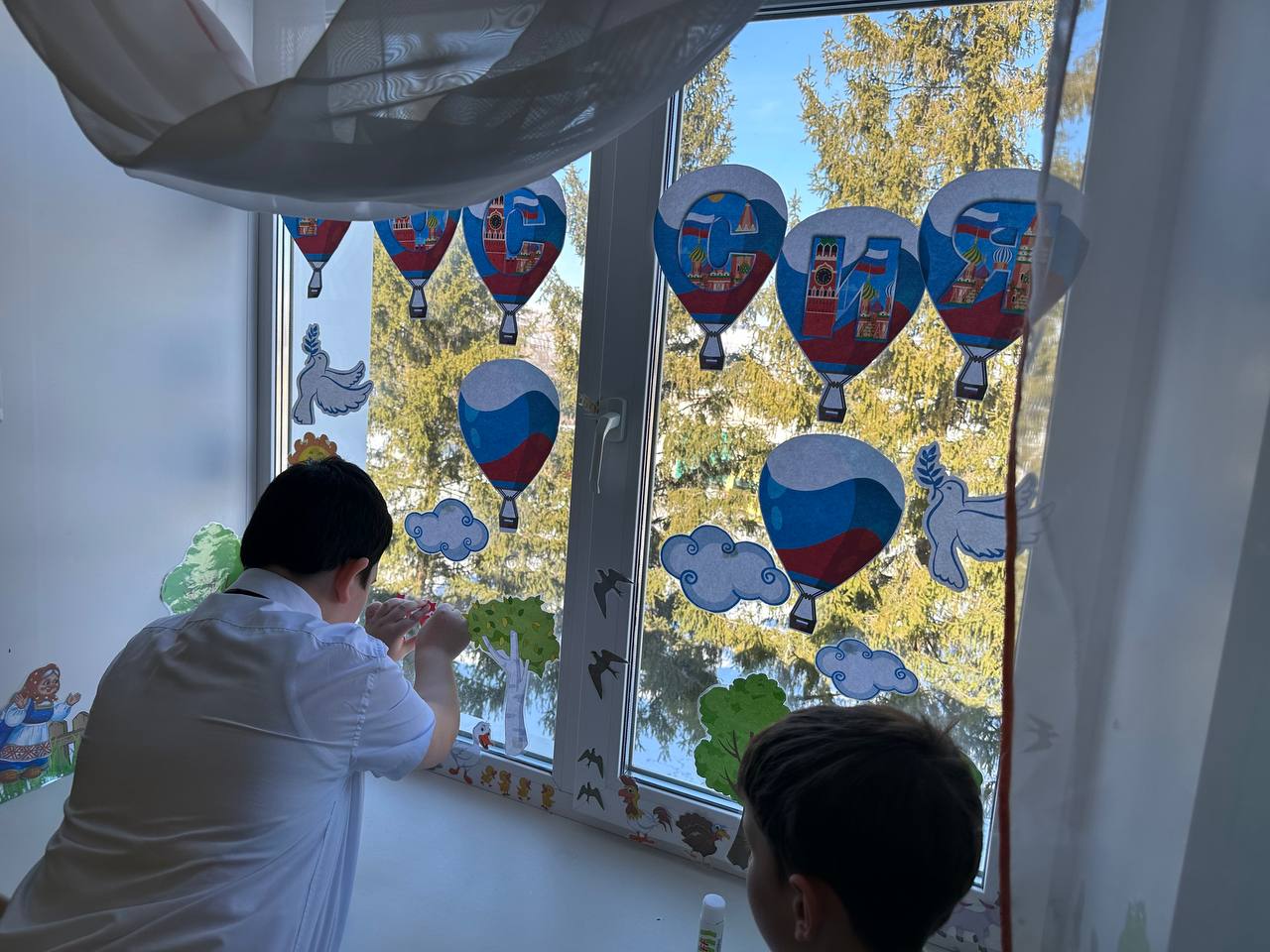 Сегодня организована акция «Окна Русской весны». Советник директора по воспитанию и взаимодействию с детскими общественными объединениями, Низамутдинова Н.В. предложила ребятам 3 класса оформить окна в Центре Детских инициатив на тему воссоединения Крыма и России.
