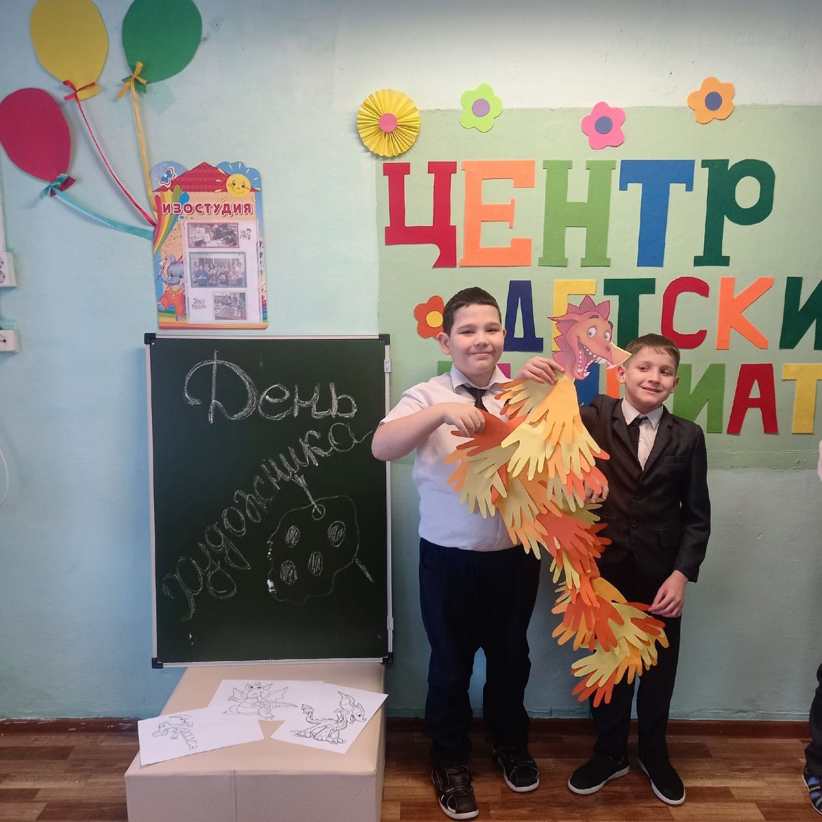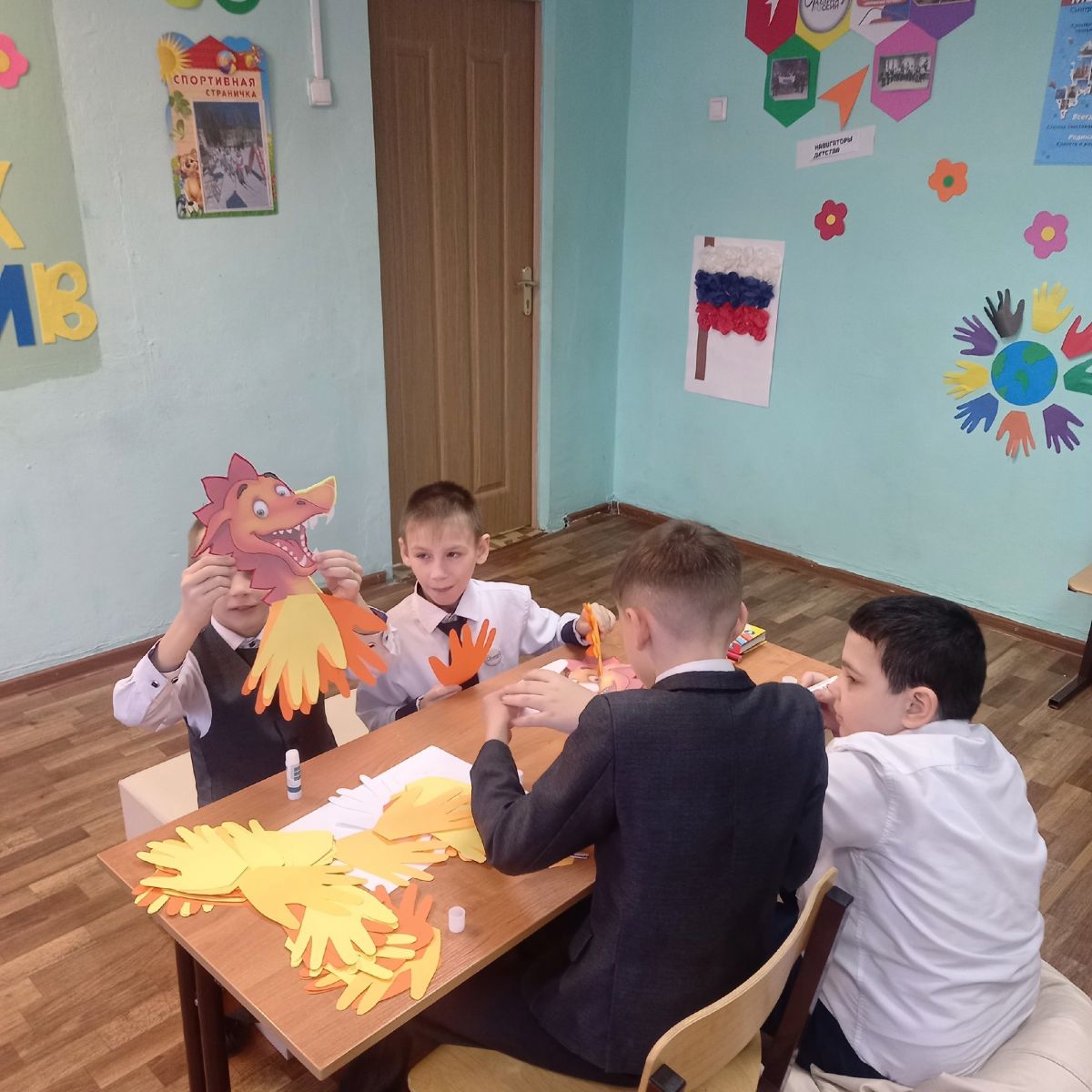Советник директора по воспитанию и взаимодействию с детскими общественными объединениями, Низамутдинова Н.В., совместно с обучающимися 3 класса организовала мастер - класс «Школа новогоднего волшебства», в Центре Детских Инициатив. Ребята с большим удовольствием раскрашивали наступающий символ 2024 года, весёлого дракошку, а далее создали поделки "Дракон из ладошек", которыми украсили окна.