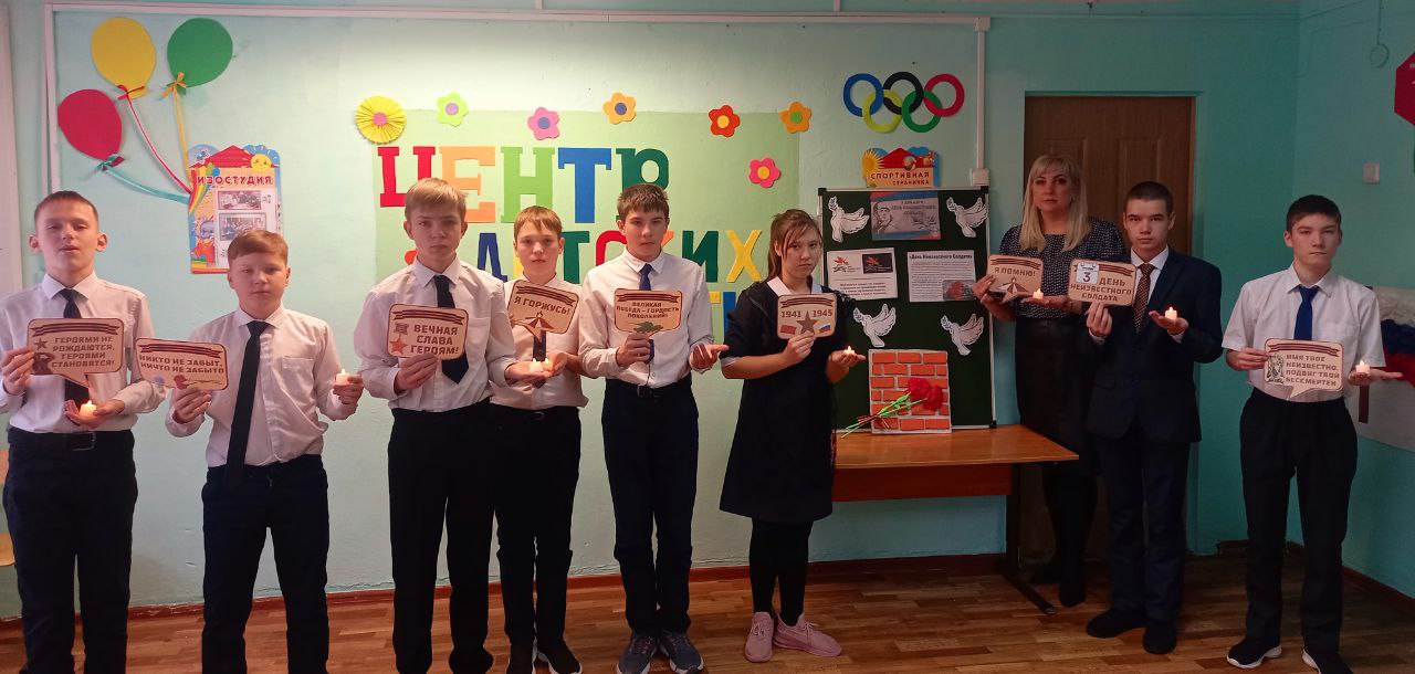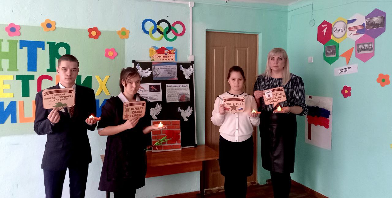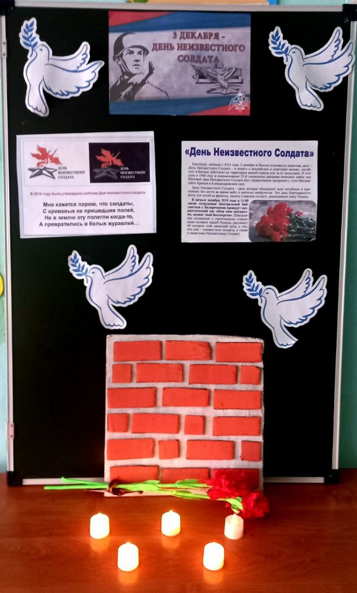 Эта памятная дата – дань уважения бессмертному подвигу павших защитников Отечества, чьи имена остались неизвестными. Эта сравнительно новая памятная дата в российской истории. Этот памятный день призван увековечить память, воинскую доблесть и бессмертный подвиг советских и российских воинов, которые погибли в боевых действиях и чьи имена остались неизвестными. В рамках Дня Неизвестного Солдата 4 декабря в нашей школе - интернате проведена акция «Зажги свечу». Минутой молчания и зажжёнными свечами ребята почтили память защитников Отечества.