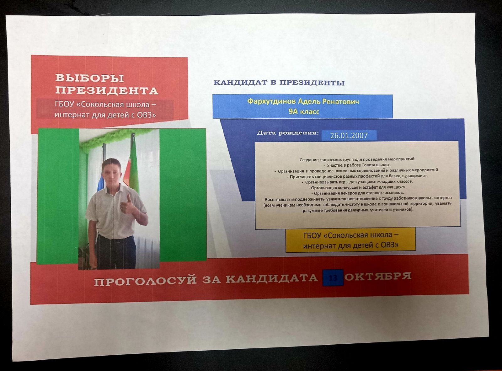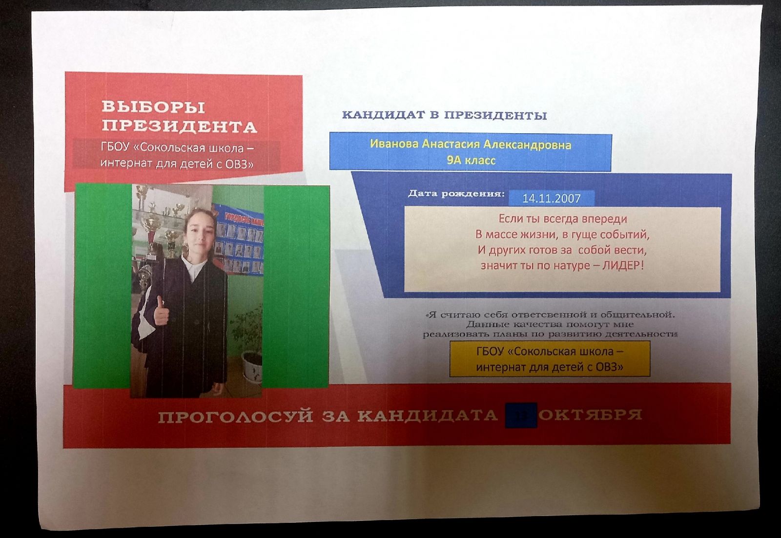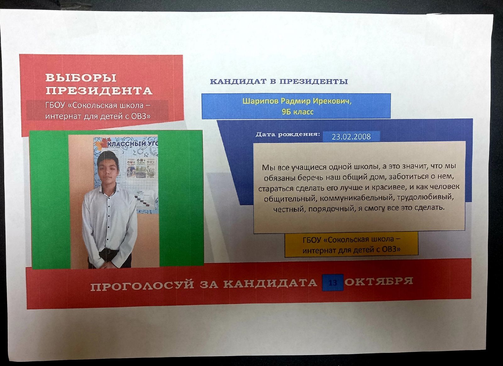 13 октября в ГБОУ "Сокольская школа-интернат для детей с ОВЗ" состоялись выборы Президента школы! В течение дня обучающиеся, педагогический коллектив, сотрудники школы - интерната голосовали за кандидатов. Результаты голосования: 1. Иванова Анастасия- 48 голосов, 60%. 2 . Фархутдинов Адель- 27 голосов, 33 %. 3. Шарипов Радмир- 3 голоса, 7%. Поздравляем всех кандидатов с окончанием выборов, а новому Президенту школы и её команде желаем плодотворной работы!