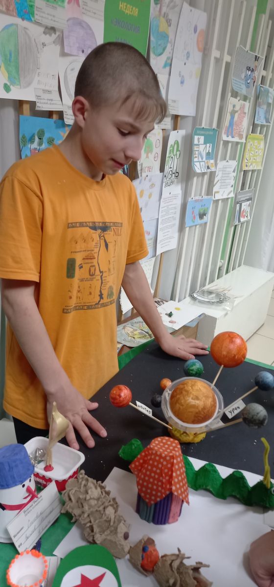 Воспитателями, был составлен план проведения творческой недели «Экология и мы».В понедельник, 10 апреля, был оформлен стенд и центр творческой мастерской на первом этаже школы. Объявление: конкурс рисунков, поделки из бросового материала, создание объёмной коллективной аппликации, акции о сдаче батареек и макулатуры.Во вторник на общешкольной «линейке» было объявлено о проведении творческой недели. Оглашены все мероприятия, акции. Обучающиеся всех групп совместно с воспитателями подготовили рисунки с лозунгами: «Берегите природу», «Сохраним природу вместе» и т.д., а также рисовали рисунки на тему; «Космос». Изготовили поделки из бросового материала, объёмные аппликации, сдавали батарейки, макулатуру. Выставки были оформлены на первом этаже школы - интернат.В среду в рамках творческой недели прошло открытое воспитательное мероприятие, приуроченное ко Дню Космонавтики «Дорога в космос». Мероприятие провела воспитатель Салахова А.Б..В четверг обучающиеся совместно с воспитателем Низамутдиновой Н.В. отправились в космическое путешествие, была создана поделка «Планеты солнечной системы», а ребята примерили на себя шлемы – маски от скафандра.В пятницу были подведены итоги насыщенной недели. Воспитатели 5 группы наградили всех учащихся, принявших активное участие в творческой неделе. Все присутствующие получили заряд прекрасного настроения, а победители - грамоты и подарки. Подготовили и провели творческую неделю, воспитатели 5 группы: Низамутдинова Н.В., Салахова А.Б. -