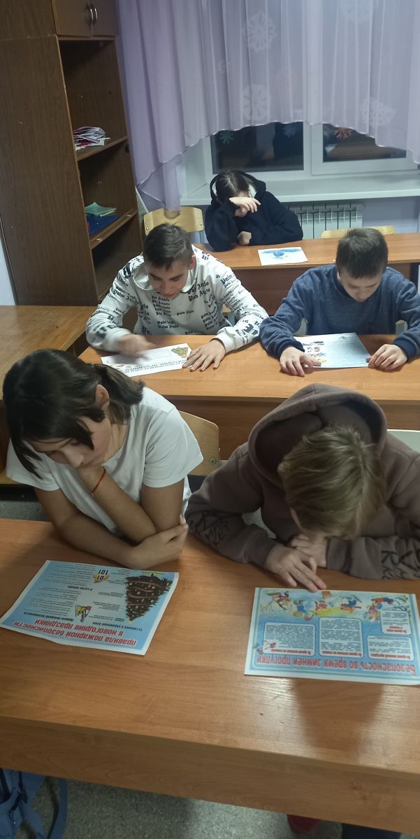 В 7 классе проведено воспитательное мероприятие на тему: «Инструктаж по безопасному поведению на зимних каникулах». Ребятам подробно были освещены вопросы о том, что несовершеннолетним запрещено находиться на улице в ночное время с 21 до 06.00ч. - закреплена тема о правилах поведения на дороге в зимний период, о необходимости использования светоотражающих элементов на дороге (фликеров). - одним из главных вопросов также являлось напомнить учащимся о мерах предосторожности и правил поведения на льду. Даны рекомендации при обращении с пиротехникой. - далее учащимся были предложены раскраски: «Осторожно лёд!»; «Правила пожарной безопасности во время украшения елки»; «Правила пользования пиротехники»; - вспомнили экстренные номера телефонов специальных служб: 01, 02,03, 04