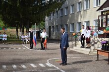 В центр школьного двора вышли первоклашки, их поздравили администрация школы и представители ООО Инженерно-производственного центра, и после поздравительных речей и вручения подарков, ученик из выпускного класса с первоклассником прошлись по кругу, звеня в колокольчик.
