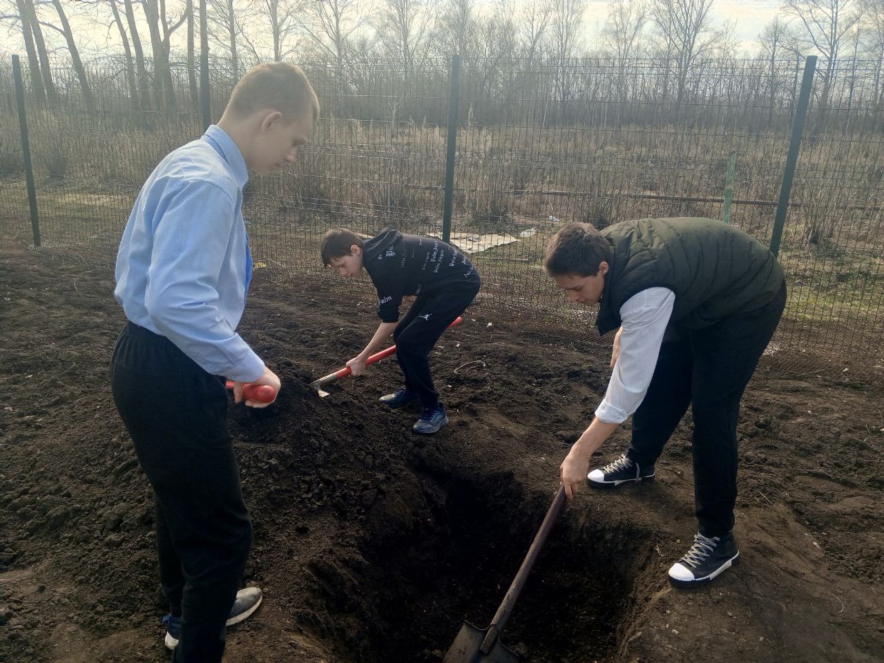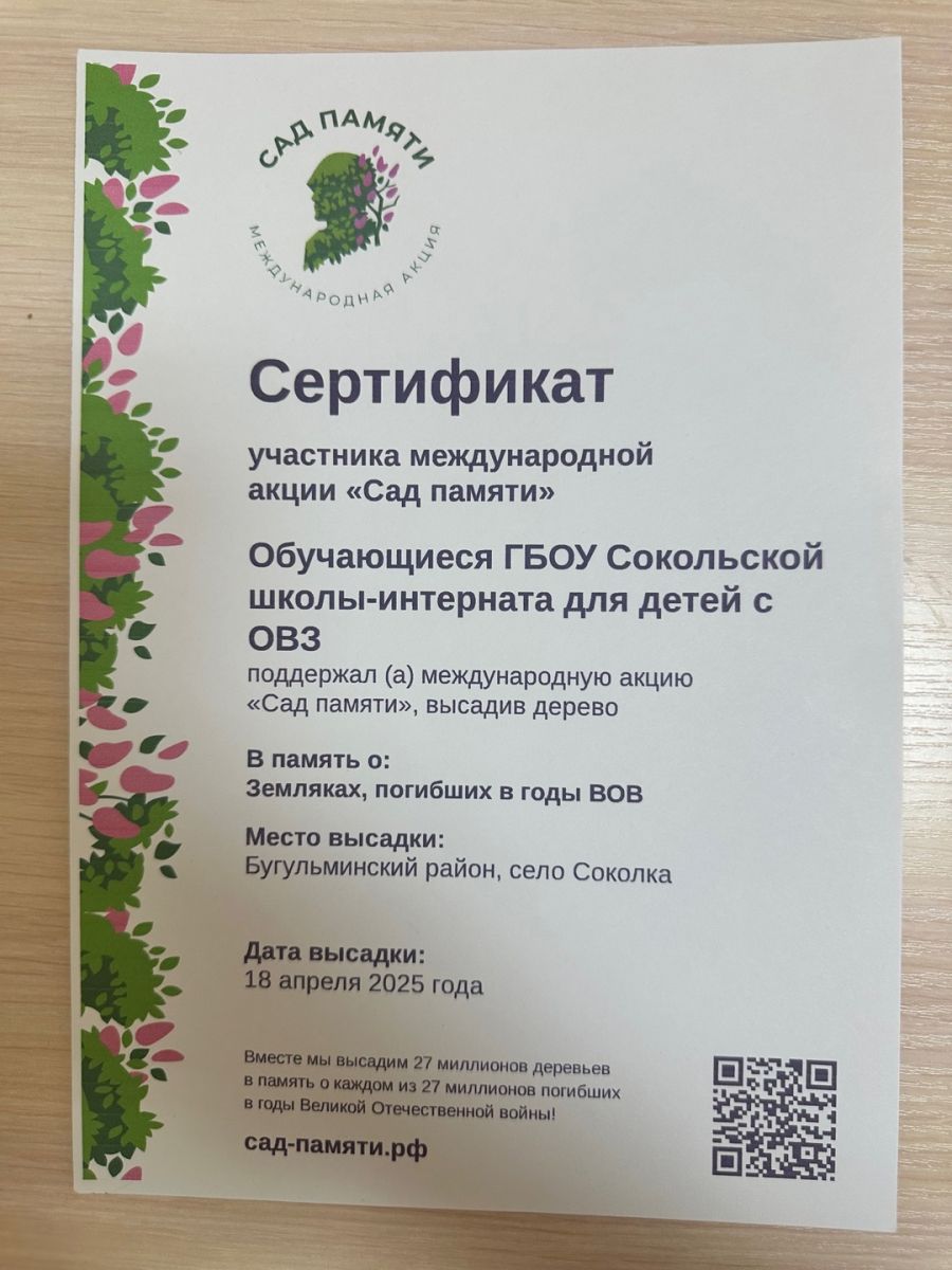 Воспитанники совместно с директором школы - интерната Матуровым Ринатом Шавкатовичем и воспитателем Емельяновой Ольгой Сергеевной поддержали международную акцию «Сад памяти», высадив яблони на территории школы.
